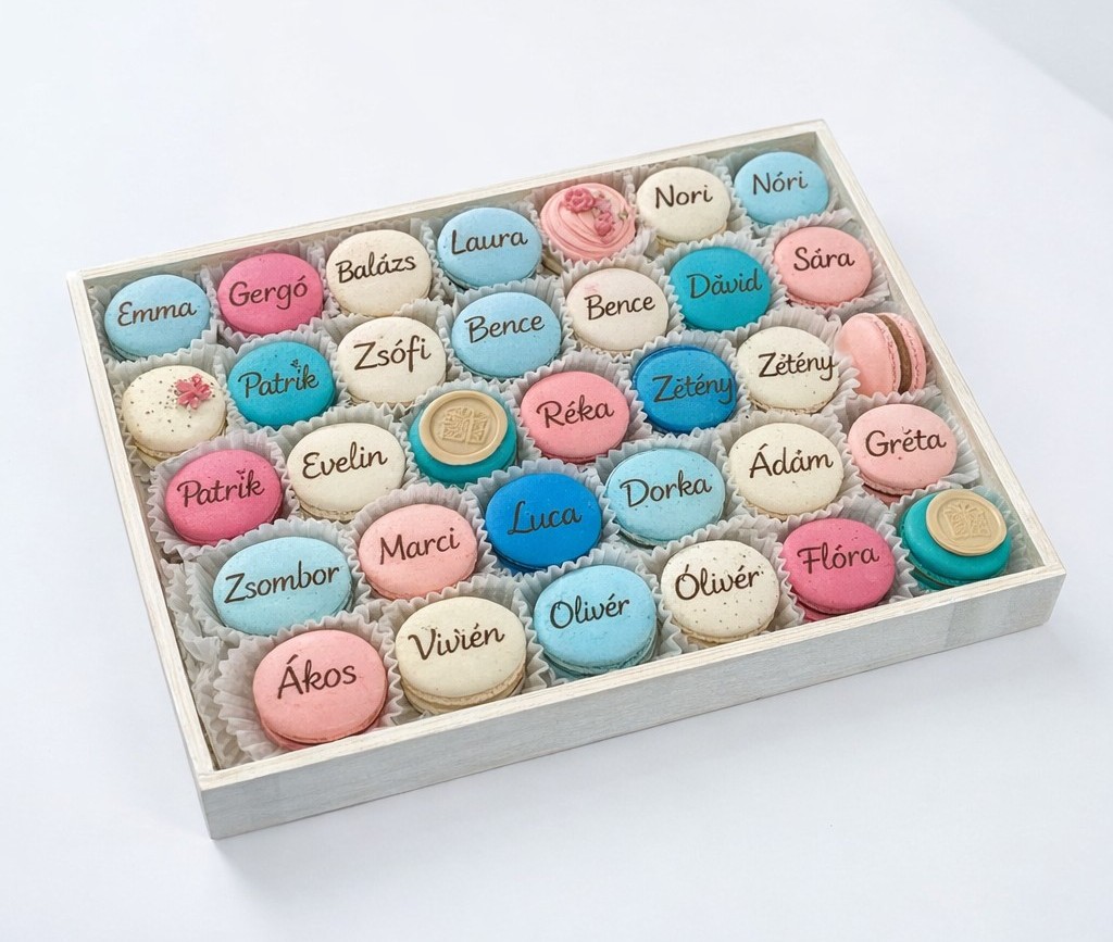 Képzelj el egy elegáns, nagyméretű dísztálat vagy dobozt, amiben pontosan annyi prémium macaron sorakozik, ahány diák jár az osztályba.