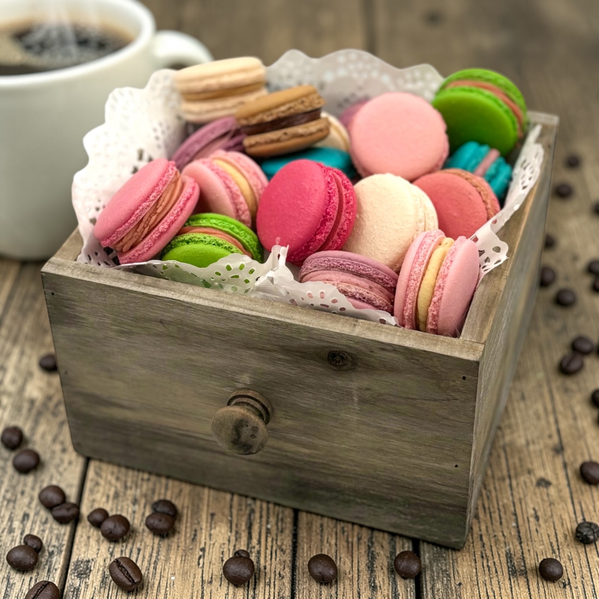 A letisztult elegancia és a csábító ízvilág tökéletes kombinációja. Az igényes, átlátható csomagolás megóvja a macaronok frissességét, miközben modern formában kínálja az édességet. Kiváló választás egy gyors, de stílusos ajándékhoz.